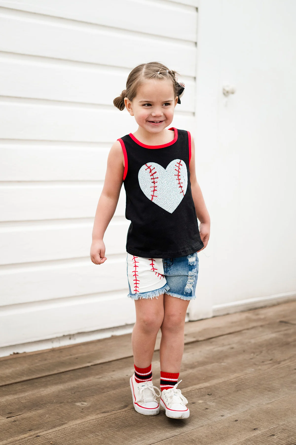 Your little one is going to be the cutest at the ballpark in our Sequin Baseball Heart Denim Short Set for girls. The set features a black tank top with a sequin baseball heart on the front and looks adorable paired with the matching denim shorts. The stretch waistband helps comfort and fit and can be great for on the go, while the distressed detailing adds a fun touch. She can pair this set with sandals or our fun bows for the perfect look!