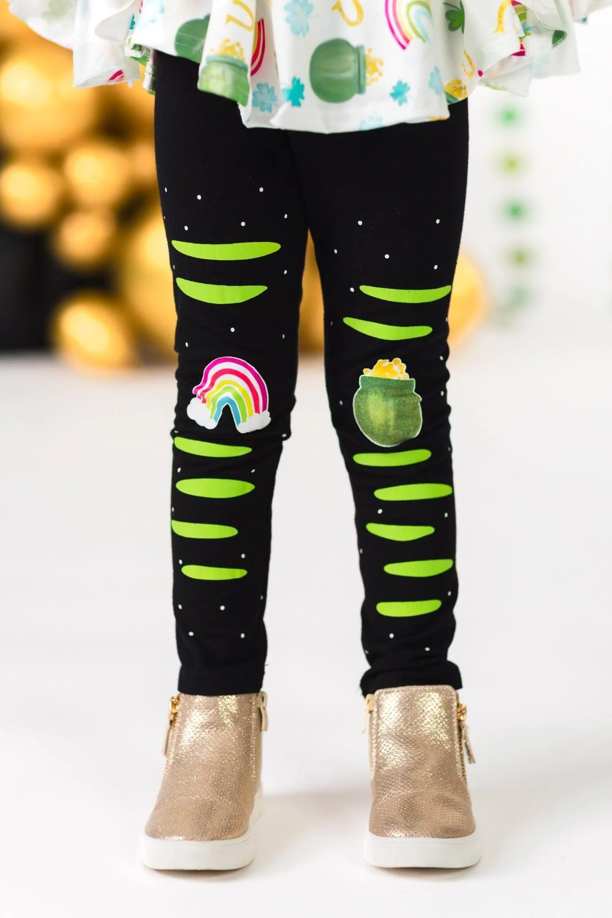Bring on the season of luck with our End Of The Rainbow Legging Set for girls. This bell sleeve top looks adorable paired with the matching leggings. The stretchy waistband helps comfort and fit and can be great for on the go, while the printed distressing and rainbow & pot of gold adds a fun touch. The top and bottoms can be worn as a set and paired with our SIP bows or keep it laid back with a pair of booties, sheâll shine bright this Holiday season!