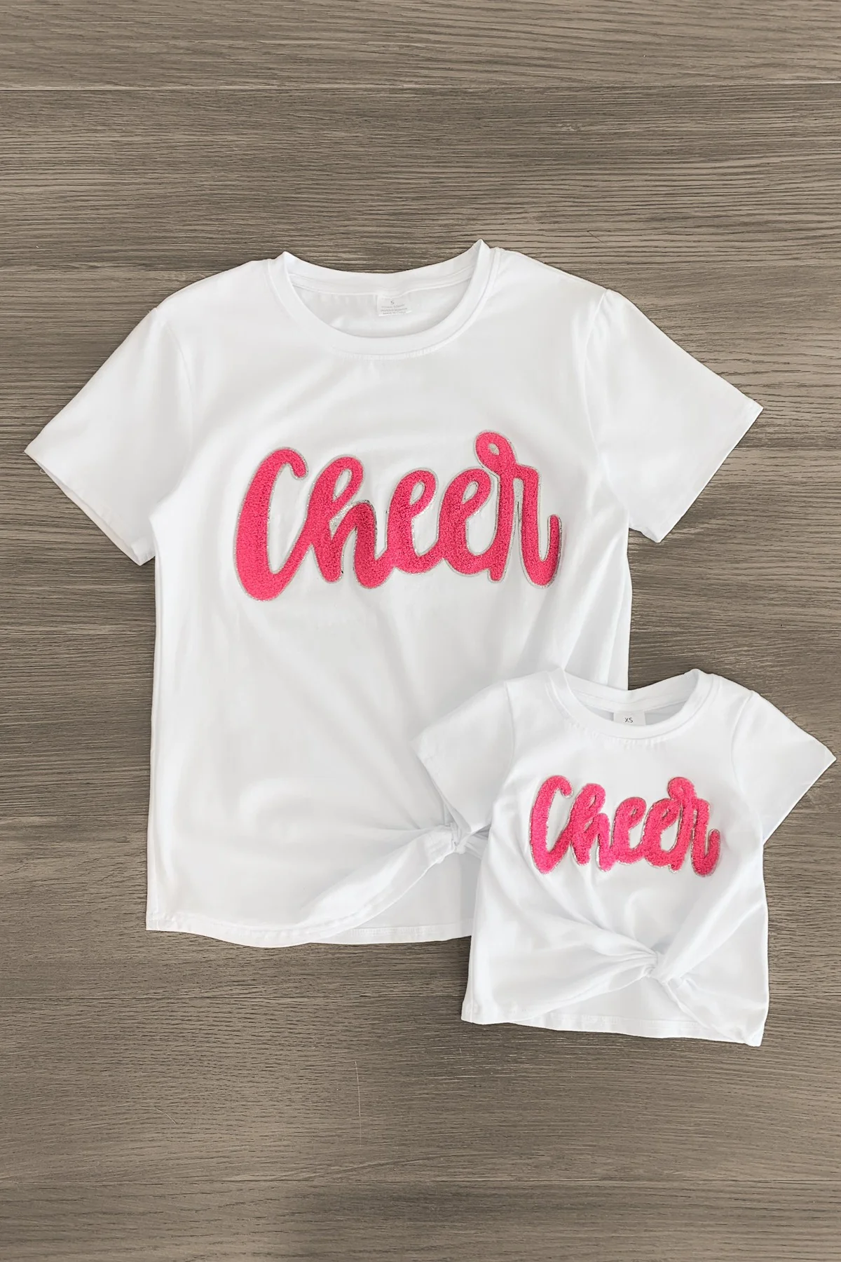 - Mom & child tops both feature a "Cheer" chenille patch on the front